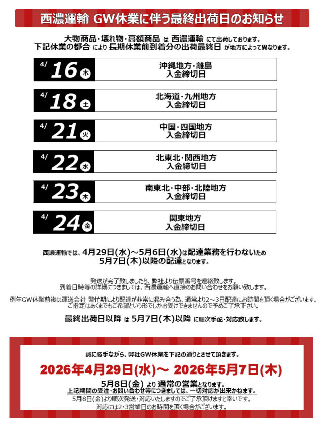 西濃運輸にて発送の場合、GW前(4月28日)到着予定の出荷最終日が地方によって異なりますのでご注意ください。
